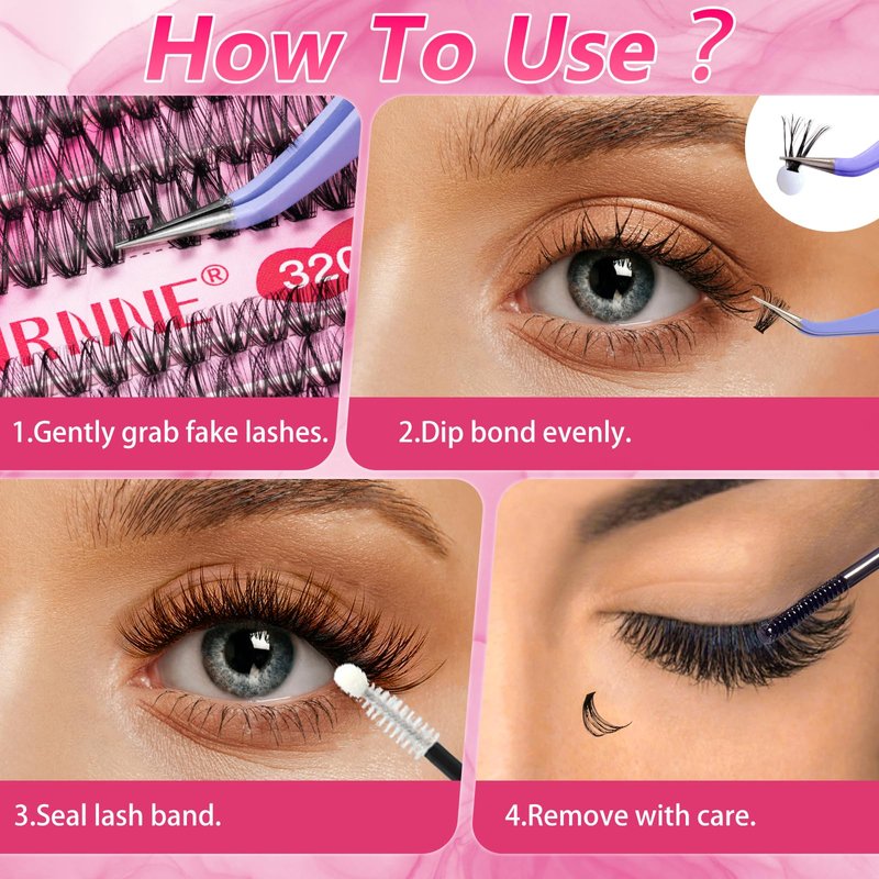 - Lash Clusters Kit: These thin band lash clusters are perfect for everyday wear, parties, and beginners. Featuring a mix of 30D and 40D curls and 320 pcs, it come with everything you need for lash extensions—like a 2-in-1 bond and seal, remover, tweezers, and brush to achieve salon quality results with DIY application at home