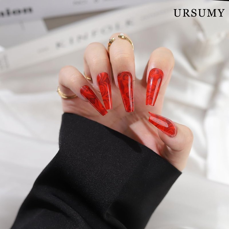 Ursumy Red Coffin Fake Nails Rose Press on Nails Extra Long False Nails Full Cover Acrylic Nails for Women and Girls (24Pcs)