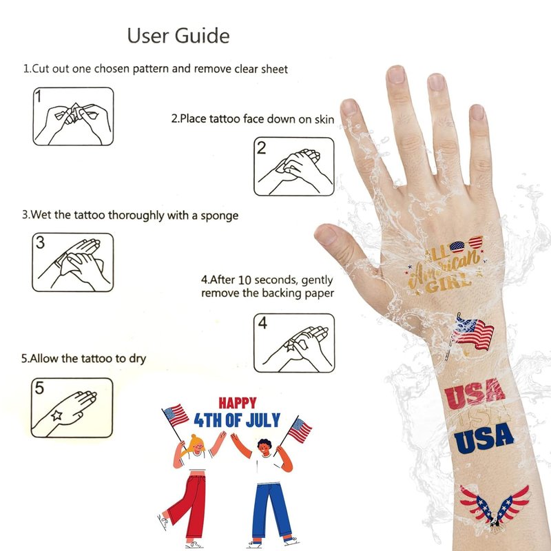 - 8 Sheets 4th of July Themed Different Style temporary tattoos for Boys Girls Women Men. Whether it’s 4th of July, Veteran’s Day, or Memorial Day, these patriotic tattoos for kids add a patriotic touch to the celebrations.