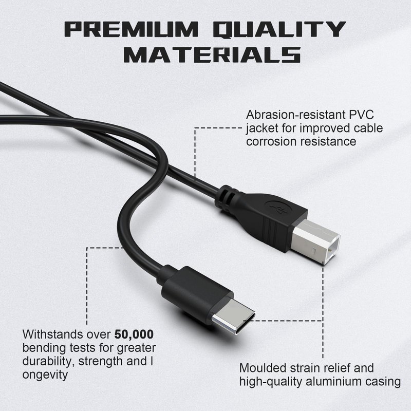 - PREMIUM QUALITY MATERIALS: The USB C to USB B printer cable features an abrasion-resistant PVC jacket to increase the cable's corrosion resistance. With molded strain relief and high quality aluminum housing, it can withstand 50,000+ bending tests, more durable, stronger and longer service life.