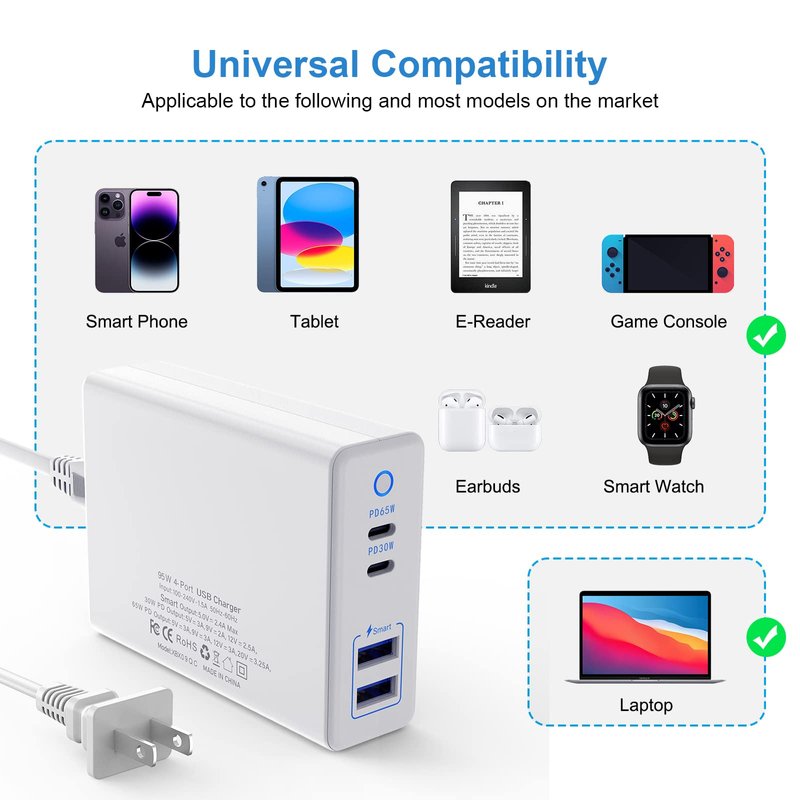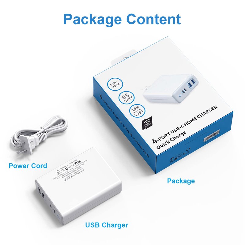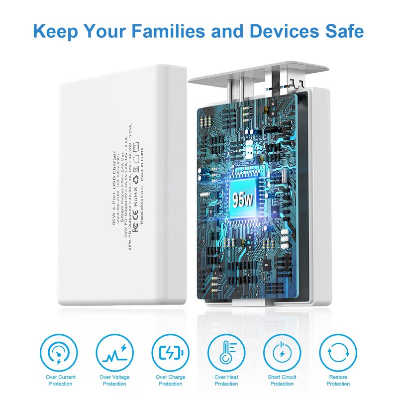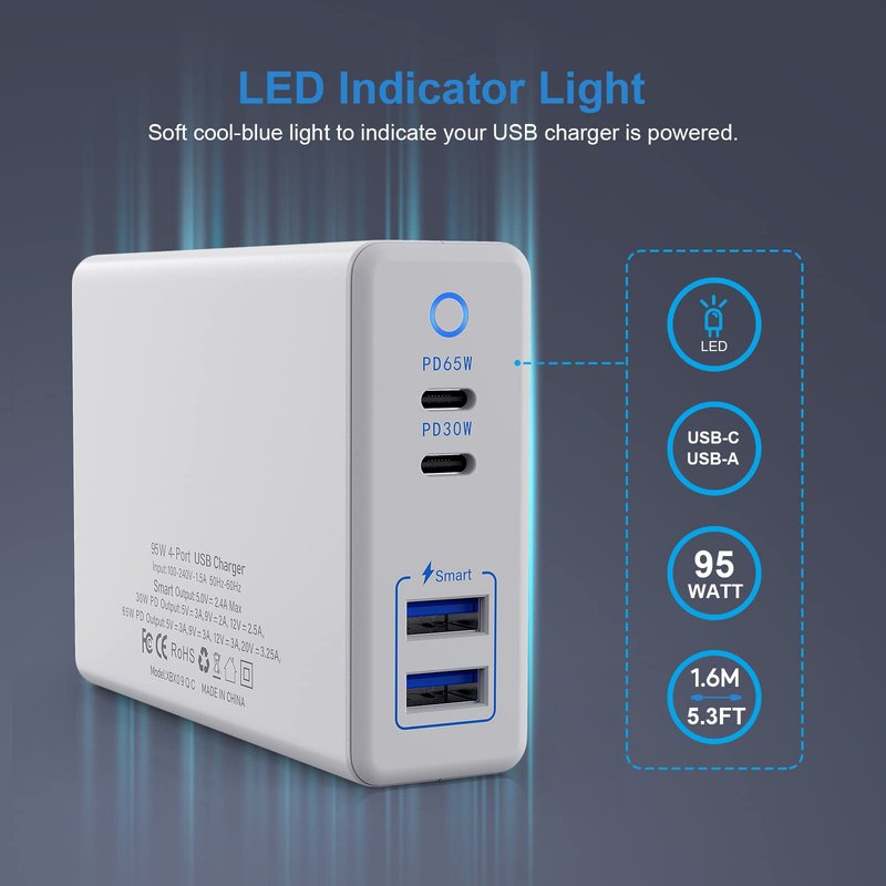 - 4 Port USB Charger: 2 USB A and 2 USB C output ports out 95 watts of power. Detect your device to deliver its fastest possible charge up to 2.4 amps per port
