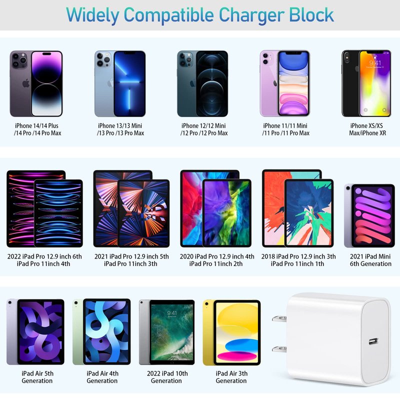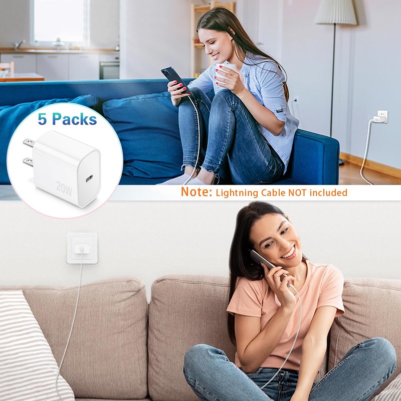 20W USB-C iPhone Charger Fast Charging: Fast Charging USB-C port provides a maximum power output of 20W, offer fast and efficient charging three times faster than the 5W charger and charges iPhone 13 12 devices to 60% in 30 minutes. lightweight Type-C Wall Charger Block: The compact design saves space and is easy to put into bags and pockets. You will get 5 pack iphone charger to meet your daily meet.