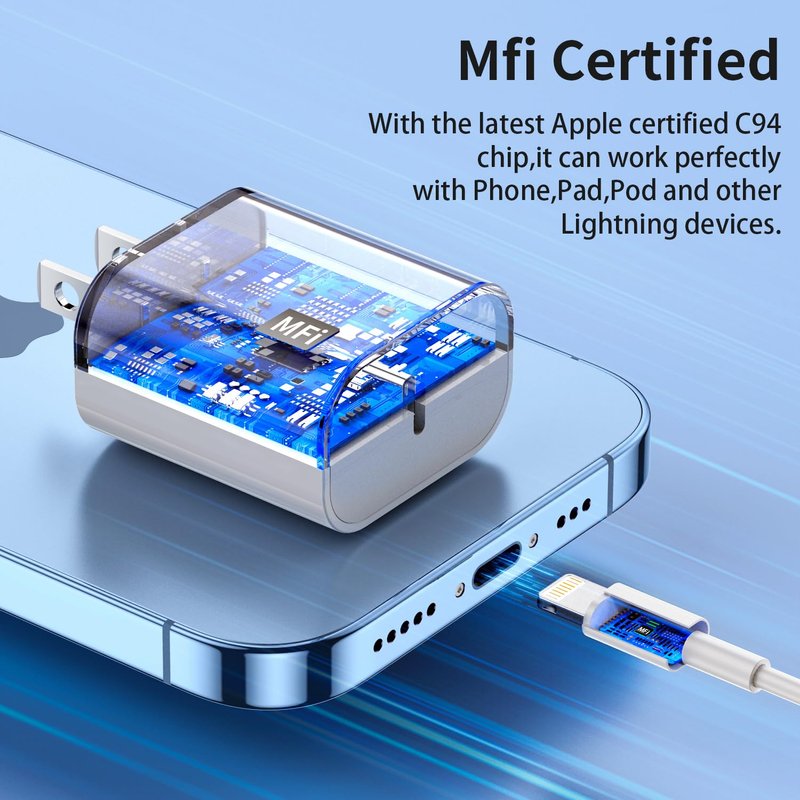 - 【Superior Safety Fast Charger】20W lightning charger has multipotent safety system ensures complete protection for your lightning devices. The UL certified wall charger built-in over-voltage protection, features a stable voltage. the lightning cable built-in smart chip to match the current required by devices automatically.