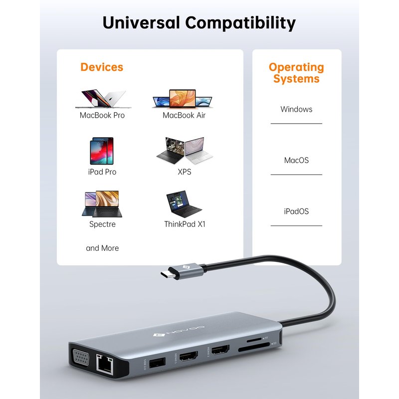 - 【NOVOO 11 in 1 docking station】: This USB C Docking Station features 2 HDMI ports, VGA port, 1Gbps Ethernet port, 2 USB-A 2.0 ports, 2 USB-A 3.0 ports, 100W PD port, SD/TF card readers. This docking station dual monitor enables you to connect multiple devices and peripherals to your laptop with one simple USB-C cable. You can enjoy the convenience and efficiency of this docking station.