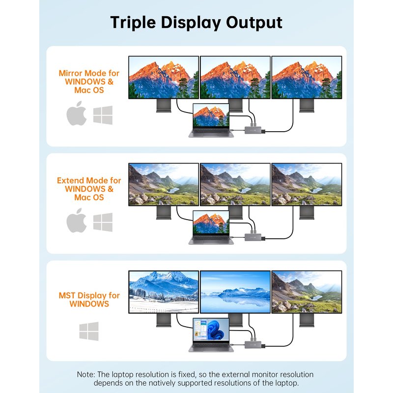- 【Dual Monitor Docking Station】: Experience stunning visuals on up to three monitors with this usb c docking station that supports dual 4K HDMI(DP1.4 protocol needed) output at 60Hz and VGA output at 1080p@60Hz. You can mirror or extend your laptop screen to up to 3 monitors for Windows laptops. Note 1: For Extend mode, MAC OS can Only Extend One Monitor (4K@60Hz). NOTE 2: ASUS VivoBook 2022 NOT SUPPORT HDMI OUTPUT.