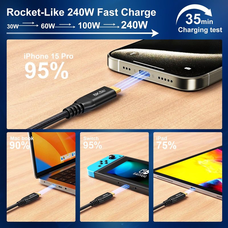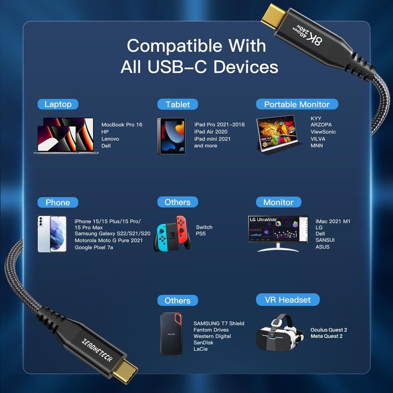 - 【Newest USB 3.2 cable】ZeroneTeck USB C Cable supports the latest Thunderbolt 4 standard for up to 40Gbps of bandwidth, Ultra HD 8K@60Hz video or Dual 4K, and 240W fast charging, support USB PD 3.1 Extended Power Range (EPR) including 20V/100W, 28V/140W, 36V/180W.