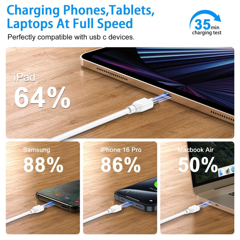 - 【60W Super Fast Charging & 480Mbps Transfering】: The usb c to c moto g stylus 5g 2024 power cord android charger type c cable Supports safe fast-speed charging 60W and data syncing speed up to 480Mb/s. This usb to usb c cable motorola edge 2024 cable guarantes 60W super fast charge for samsung phone, iPhone 16 15 series, ipad pro and macbook pro charging cable. It can quick charge a moto g 2024 up to 70% power, a iPhone 16 pro 70%, a MacBook Air 50% and an iPad Pro 64% in 35 minutes.