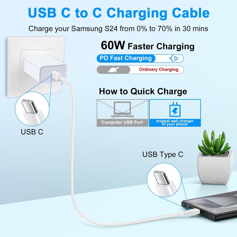 1.The moto g 2024 charger cord 3 ft cable with high quality copper wires ensures rapid charging 60W while charging. Charging time despend on whether a USB C Port Adapter supports fast charging.
