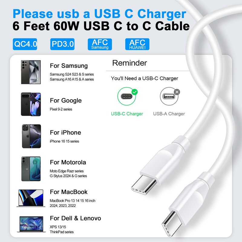 - 【Compatible for All USB C Devices】: Usb c to usb c cable fast charging car charger cord is compatible for all USB-C devices, including phones, tablets, and laptops. Motorola Edge 2024 2023 2022, Razr 2024 2023 2022 Razr+, Razr Edge 50 Ultra Pro Fusion 40 30 Edge+, Moto G Stylus 5G 2024 2023 2022 2021, G 2024, G 5G 2024,G Power 2024 2023 2022 2021 2020, G Play 2023 2022 2021 2020, G Pure, G Fast; iPhone 16 15 series MacBook Pro Air and USB C port Laptop for Lenovo, Dell, HP and any USB-C device.