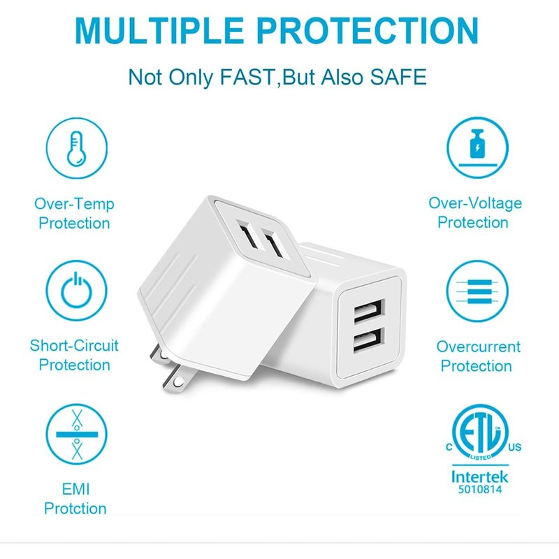 - Safe & Quality Reliable USB Fast Charger for iPhone Block: Dual Port USB Wall Charger has protection system against over charging, over currents, and over heating. The charger heads will automatically stop charging when power is full, which can maximumly protect your device.