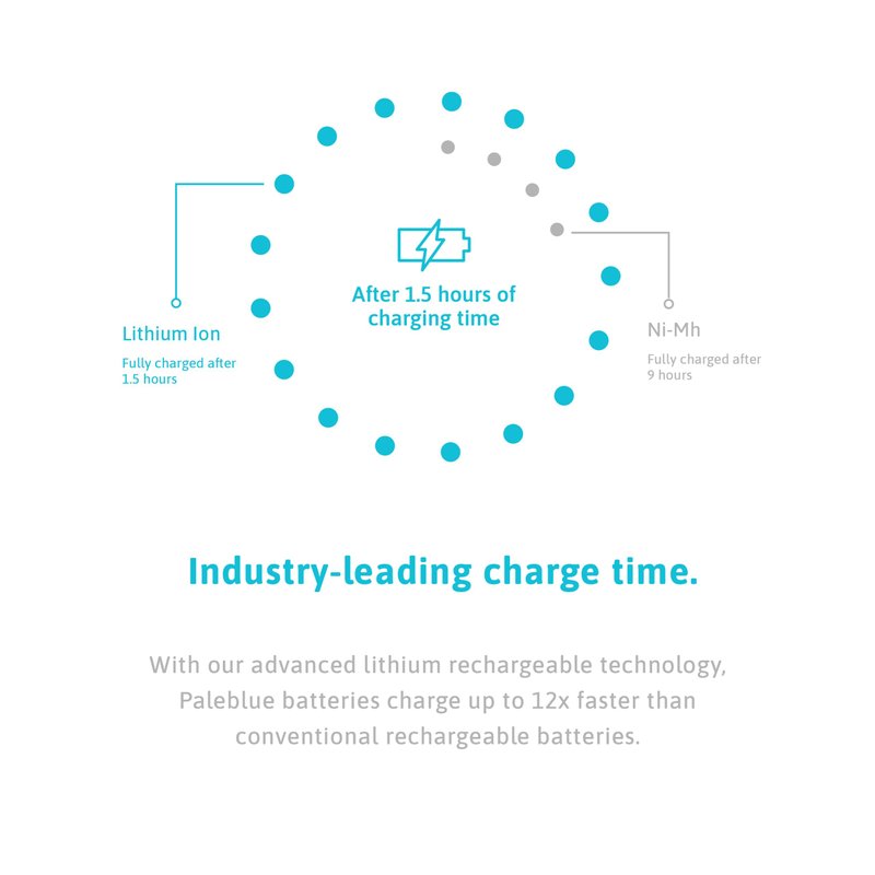 - INDUSTRY LEADING 1.5 HOUR CHARGE TIME: With our advanced lithium rechargeable technology, Paleblue batteries charge up to 12x faster than conventional rechargeable batteries.