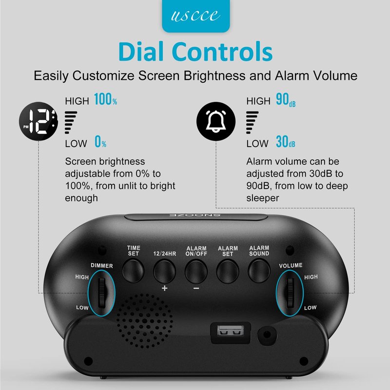Getting out of bed will no longer be a chore with the help of the USCCE bedside alarm clock for 5 selectable alarm sounds, easy-to-read 4.6" large LED display, adjustable alarm volume and a USB output for mobile charging. The sleek and minimalist alarm clock with compact size goes with any decor. Perfect for home, bedroom, kitchen, hotel, office, nightstand, table, desk, shelf, guess room, TV room. 0-100% Adjustable Dimmer