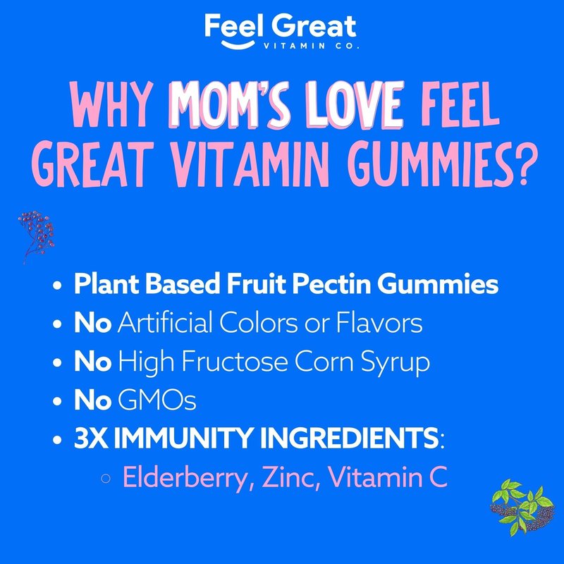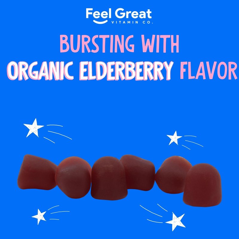 DISCOVER THE BENEFITS OF ALL-NATURAL ELDERBERRY Do you want an easy way to protect your kids against seasonal health afflictions? Are you looking for vitamins and supplements that they actually WANT to take? Keep young immune systems protected with Feel Great Vitamin Co elderberry gummies! The Power of Elderberry Did you know Native American peoples, as well as European herbalists, first used elderberry centuries ago to support immunity and resistance to health ailments? At Feel Great 365, we know that nothing is more important than the health of your children. That's why we've turned to the centuries long-trusted power of elderberry, creating an all-natural immune system supporter that kids just can't get enough of! Immune Supporting Nutrition Elderberries are loaded with essential vitamins and minerals such as: Vitamin A Vitamin C Potassium Calcium Iron Quality Ingredients Our gourmet gummies are consciously created with all-natural elderberry extract and made exclusively from fruit pectin. 100% Cruelty Free, Gluten Free, Vegetarian, Plant-Based and Herbal Approved. Registered - cGMP Certified Feel Great 365 gummies are produced under the most stringent quality control and cGMP standards. Stop sniffles, sneezes and cold symptoms before they happen... Click ADD TO CART or BUY NOW Today!