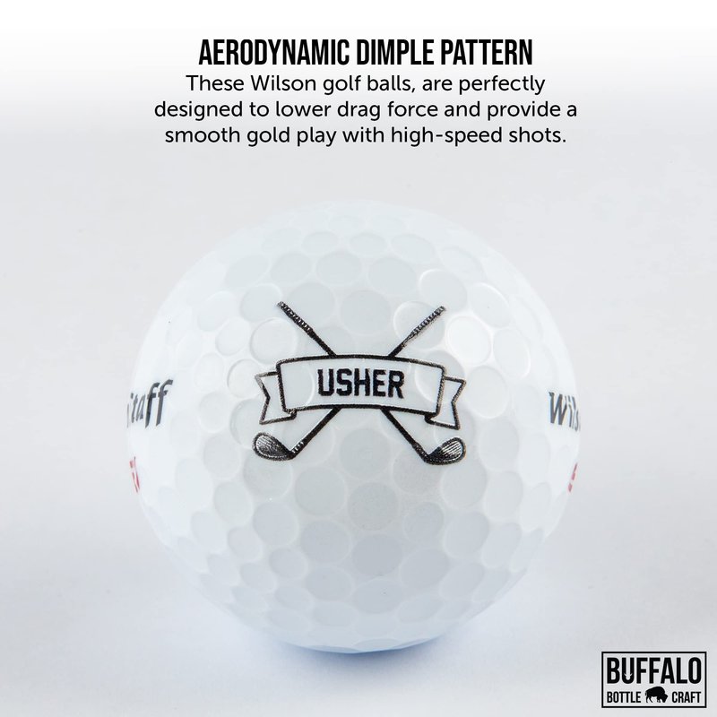 One sleeve of Wilson Staff Elite Golf Balls with "Usher" printed across 2 crossed clubs. These make a simple gift for the Best Man in your wedding. Printed in Buffalo, NY with a UV Digital Printer.
