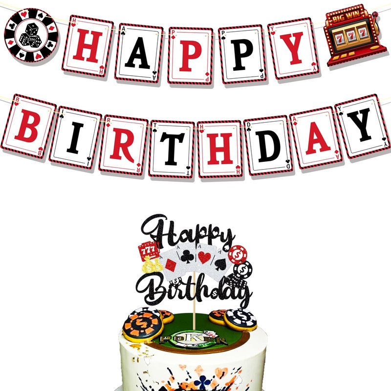 Ushinemi Casino Theme Party Decorations Poker Night Happy Birthday Banner With Glitter Las Vegas Casino Cake Decorations Poker Cake Topper Casino Party Supplies