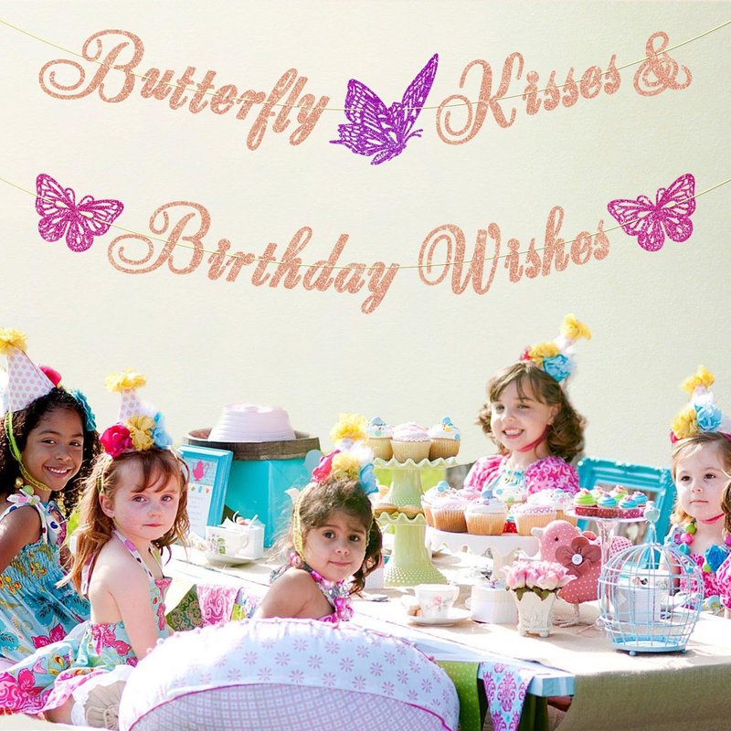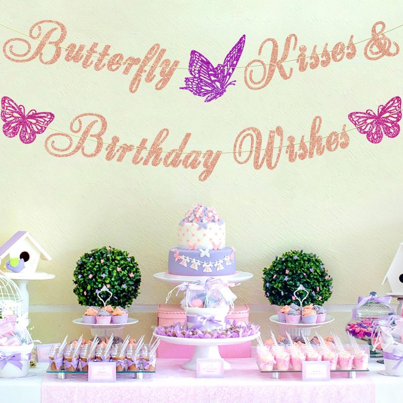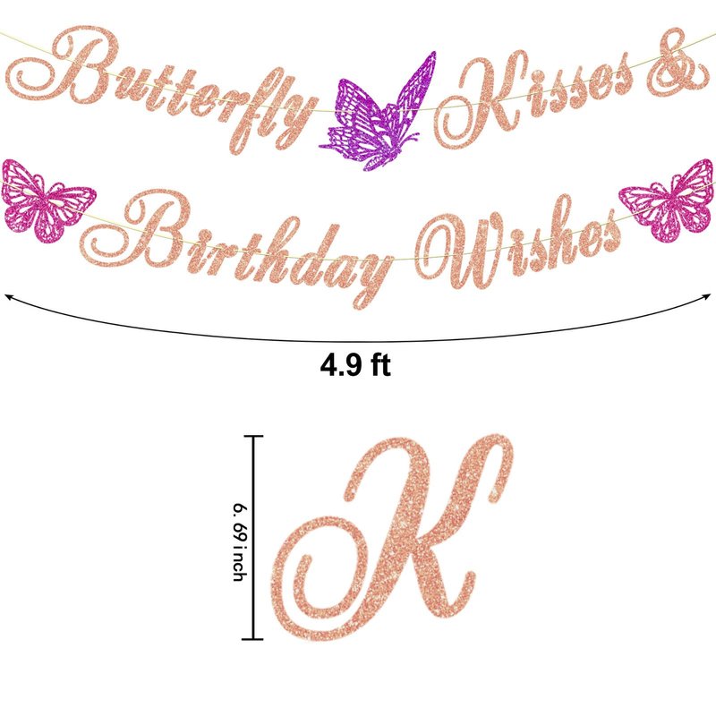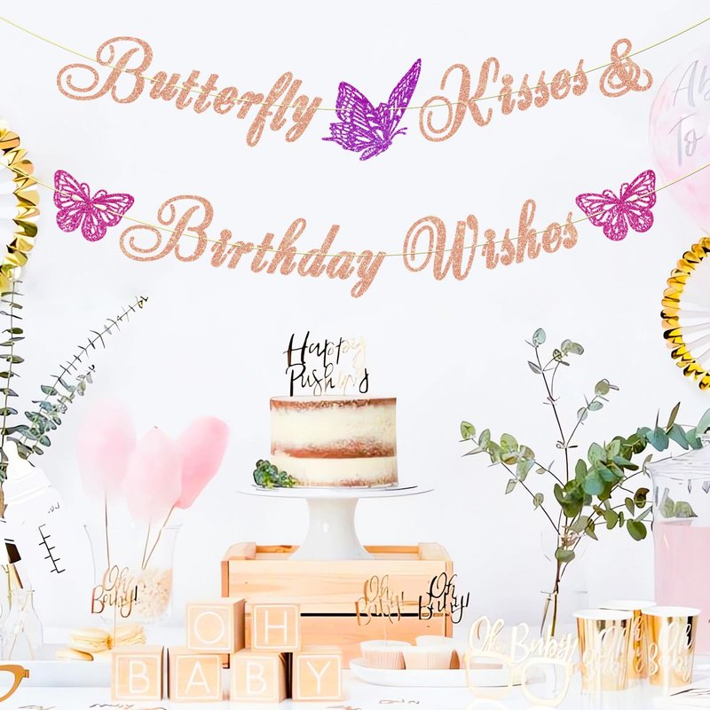 Ushinemi Glitter Butterfly Birthday Decorations Rose Gold Butterfly Kisses and Birthday Wishes Banner for Girl, Butterfly Themed Birthday Party Supplies