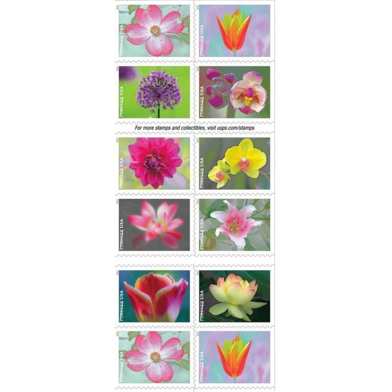 - Ten flowers stamp designs are pictured (two stamps each)