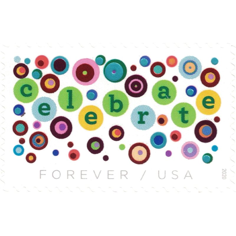 On February 14, 2020, in Mesa, AZ, the United States Postal Service issued the Let’s Celebrate! stamp (Forever priced at the First-Class Mail rate) in one design, in a pressure-sensitive adhesive (PSA) pane of 20 stamps (Item 572500). The Let’s Celebrate! stamp adds an extra dash of fun to celebratory greeting cards, invitations, and gift-bearing envelopes and packages. No matter the occasion - birthday, anniversary, holiday, engagement, new job, retirement - Let‘s Celebrate! will help send cheer to those deserving of well wishes. The stamp art features an array of colorful circles in varying sizes arranged in a random pattern. The letters in the word “celebrate,” cast in a dark green hue, appear inside several brightly colored circles on a white background. Art director Antonio Alcalá designed the stamp. This listing is for a sheet of 20 stamps.