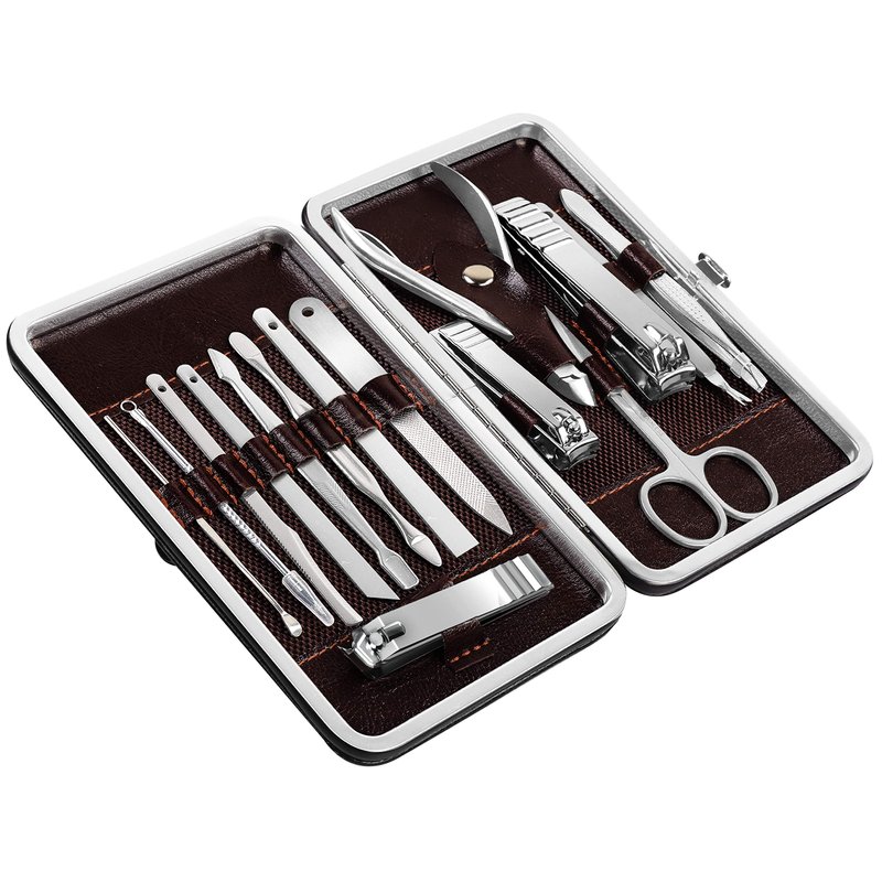 - 15 PCs MANICURE KIT- High quality, beautifully made manicure set; ideal for foot, hand and facial care. The set contains nail clippers for finger and toenails, peeling knives, cuticle trimmers, toenail nipper, nail file, v-shaped push stick, eyebrow tweezers, multi-purpose scissors, blackhead needle with loop remover and an ear pick