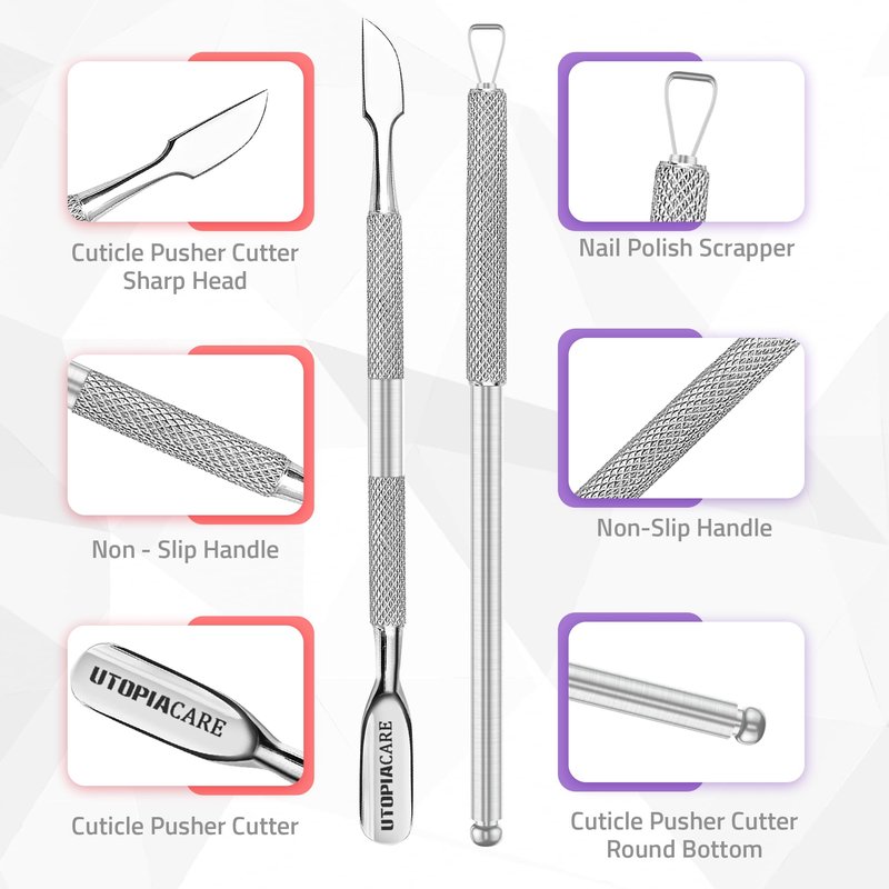 - Cuticle Trimmer Set - The cuticle kit is a mani-pedi essential, artistically crafted for your clean cuts, flawless cuticles, and DIY nail perfection. The set comprises of 1 x cuticle nipper, 1 x cuticle pusher (sharp head and flat head) along 1 x nail polish scraper.