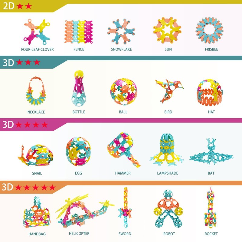- STEM Flexible Building Toys - Due to the special shape and flexible design, our building toys can be made into various models, and some of the resulting models can be used as a new toy. For example, a ball can be used to play throwing or kicking games; a handbag can be used to load some toys; several bottles and a ball can play bowling game; What's more, children can use this set of building block toys to build their own toys and spark their imagination and creativity
