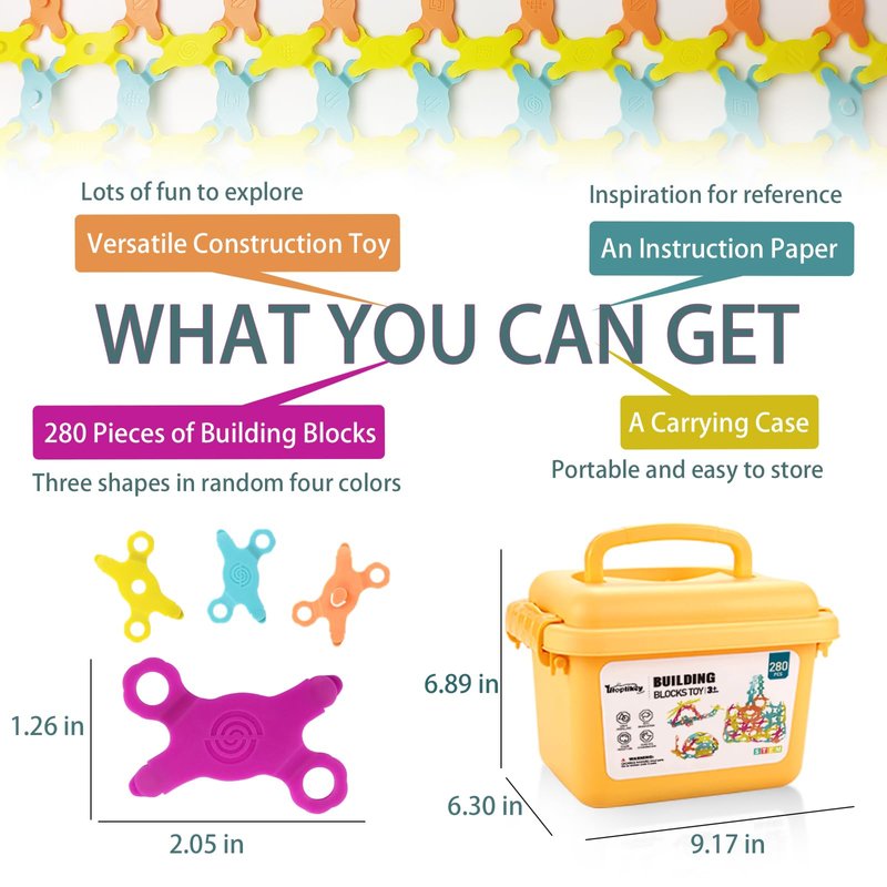 - Open Ended Construction Set with Carring Case - 9.51×7.14×6.53 inches. Including 280 pieces flexible blocks, easy to build interesting models like ball, bottle, frisbee, christmas tree, flower, portable bag and hammer and so on. Our STEM Building Game is suitable for game based learning concepts such as architecture, fine motor skills, spatial reasoning, design thinking, and creativity