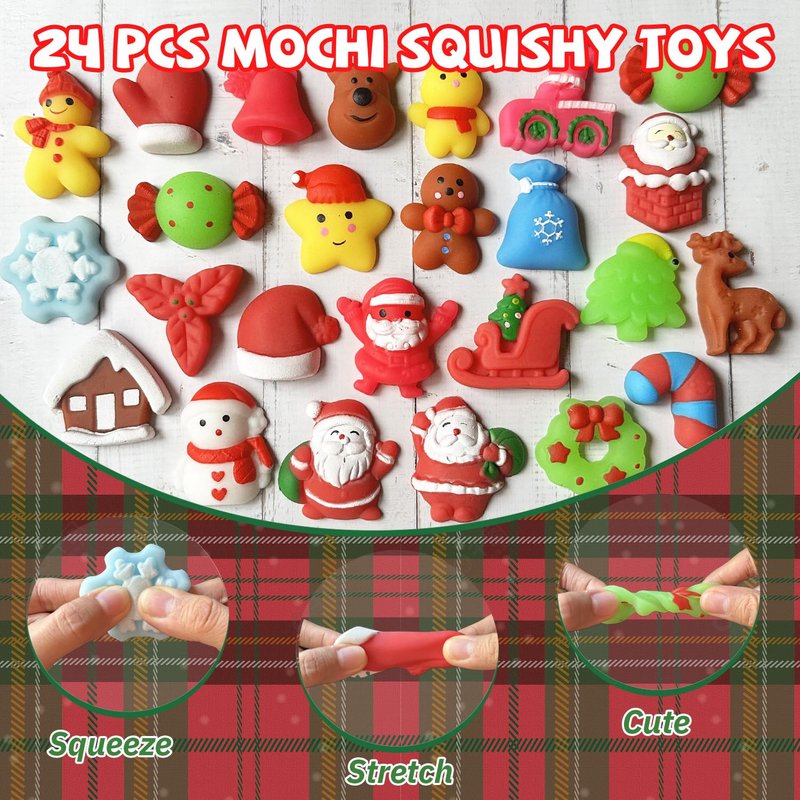 - WHAT YOU GET: Imagine the delight on your little one's face as they discover 24 unique Christmas themed kawaii mochi squishy toys nestled in a beautifully designed festive box. Each toy, a masterpiece of craftsmanship, is individually wrapped in 24 vibrant colors and intricate patterns that capture the essence of the holiday season!