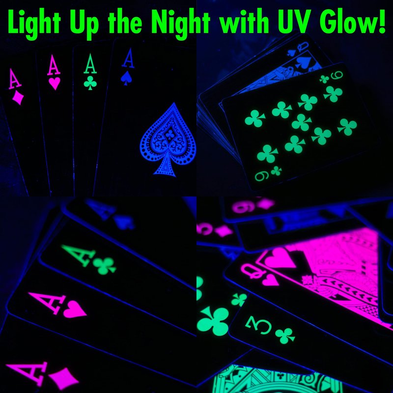 - VIVID UV REACTIVITY: These glow playing cards light up under black light, perfect for creating a fun game atmosphere. Perfect for creating a visually striking game night that shines in the dark. Note: These are not traditional glow in the dark cards—they require a UV light for the full effect (UV LIGHT NOT INCLUDED).