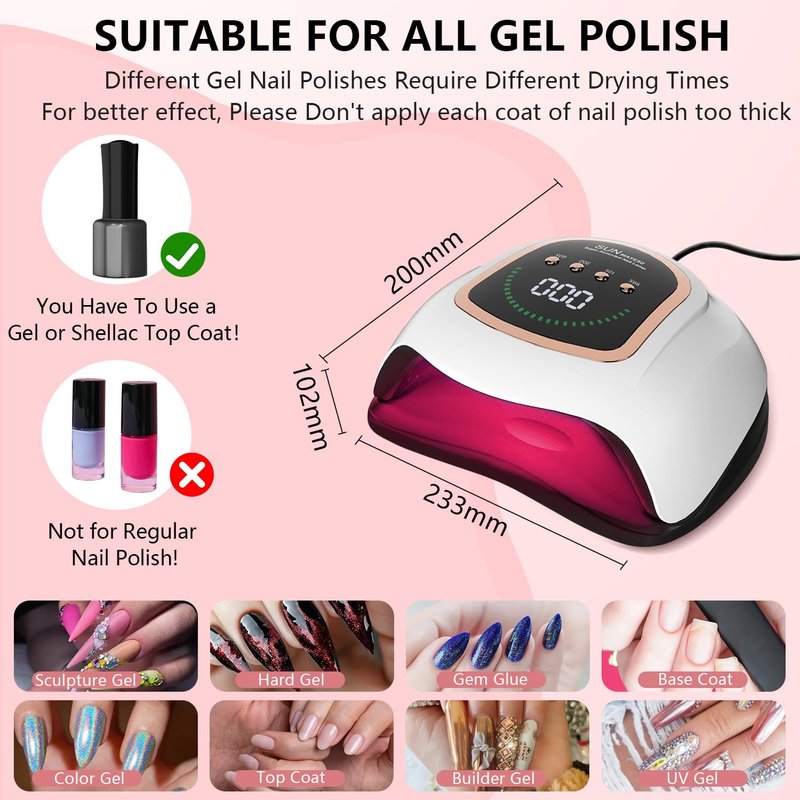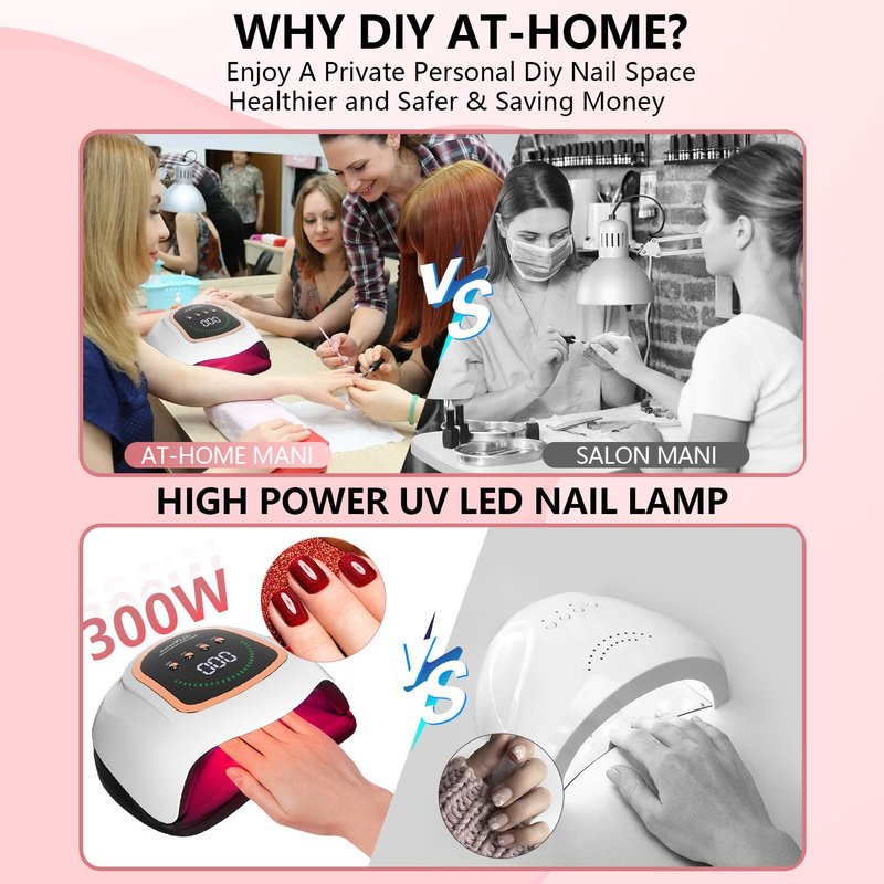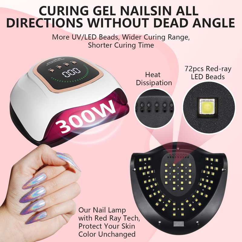 - [High Power For Fast Curing] Our UV Nail Lamp has a 300W High Power, 72 UV+LED red light beads are scattered evenly on the top and sides of the UV gel nail lamp allowing your gel nails to dry in all directions without missing any corners, Provides nail curing speeds twice as fast as most LED or UV/LED nail lights. It facilitates the curing process even for individuals with hard gels or multiple layers of thick polish gel. Easily and freely enjoy professional salon-quality nail art at home.