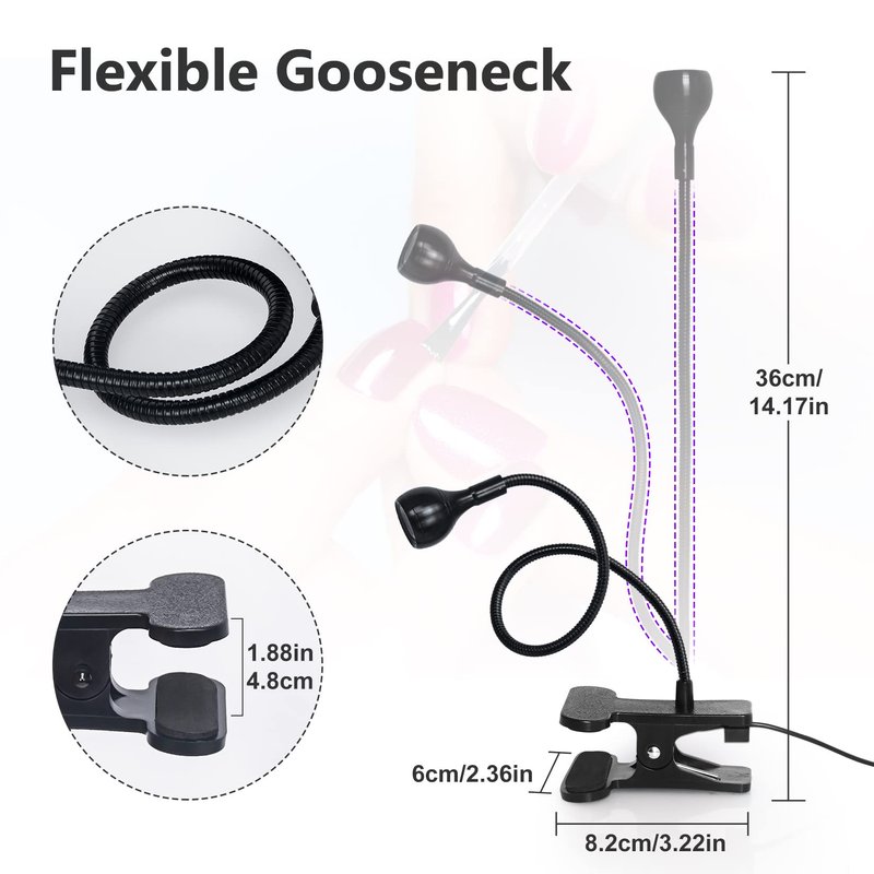 Welcome to the newly upgraded world of LED UV nail lamps! We are proud to introduce a powerful LED UV nail lamp for an unparalleled experience. With the latest technology and advanced features, this professional-grade nail lamp makes it easy to achieve salon-quality without leaving your home.Our nail lamp uses UV irradiation technology to ensure rapid curing of a variety of gel nail polishes, acrylics and other nail decorations. In just a few simple steps, you can create a flawless manicure in no time.Our nail lamp is uniquely designed with a flexible, twistable head. The light pailLed nail polish light stable base clamp can be applied to hang, clip and keep flat on the desk, gooseneck uv lamp for nails diverse ways to meet your different needs. Nail light for nail tech equipped with single chip LED, which uv light for nails is very suitable for fixing on the bedside table, desk, laptop table, headboard, etc.Our light is compact and lightweight, making it perfect for carrying. Whether you have a manicure at home, or need to travel for business or pleasure, you can easily take it with you. You can carry the lamp in your handbag or suitcase and enjoy professional-grade nail care anytime, anywhere. You are no longer limited to the time and place of the nail salon, giving you the freedom to enjoy your beauty at your own pace.Our LED UV nail lamp is a powerful and nail tool. Whether you are at home or traveling, you can always enjoy a professional-grade experience. Our LED UV nail lamp is a good choice for you. Start enjoying a quality nail experience!