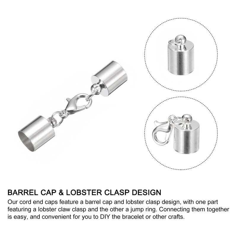 - BARREL CAP & LOBSTER CLASP DESIGN - Our cord end caps feature a barrel cap and lobster clasp design, with one part featuring a lobster claw clasp and the other a jump ring. Connecting them together is easy, and convenient for you to DIY the bracelet or other crafts. For added customization, you can replace the jump ring with an extension chain ring to achieve the perfect look for your creation.