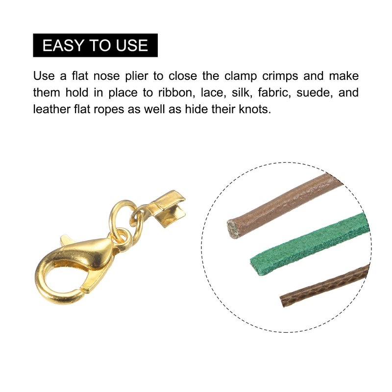 - EASY TO USE - Use a flat nose plier to close the clamp crimps and make them hold in place to ribbon, lace, silk, fabric, suede, and leather flat ropes as well as hide their knots