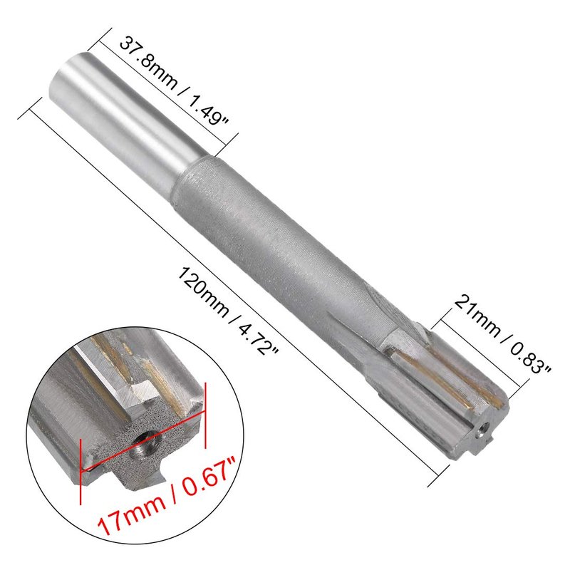 - Specifications: Cutting Dia.: 17mm / 0.67"; Tool flute length: 21mm / 0.83"; Overall length: 120mm / 4.72". Made of heat-treated tungsten carbide. Reaches H7 level of drilling accuracy and reduces surface roughness of workpieces