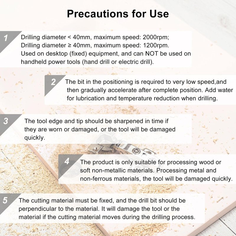 - Tips: Maximum speed: 1200rpm. Used on desktop (fixed) equipment, and can NOT be used on handheld power tools (such as hand drill or electric drill). Can not drill metal and non-ferrous metal. To avoid causing damage, be sure no nails or other metal objects in wood before drilling. The cutting edge and tip of the opener should be sharpened in time.