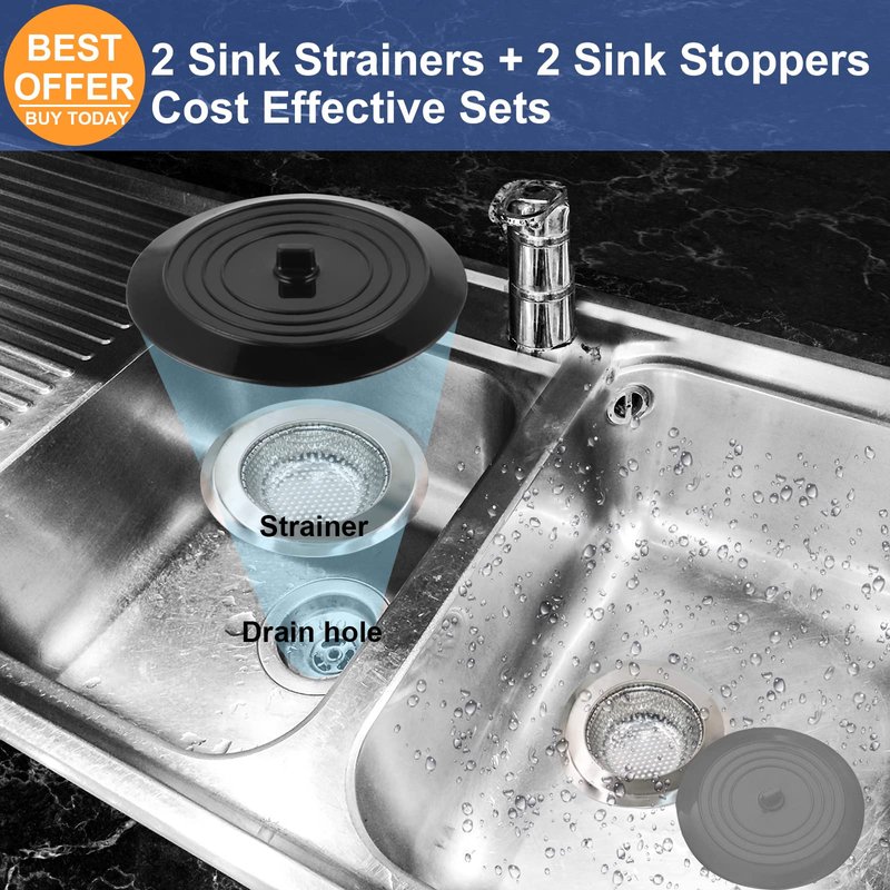 - 【Kitchen Sink Accessories】2 pack kitchen sink stopper silicone to solve sink water storage problems, can hold water with not leaking, and 2 pack stainless steel sink strainers for kitchen sink to capture food scraps, effectively prevent sewer blockages, they make great kitchen sink gadgets.