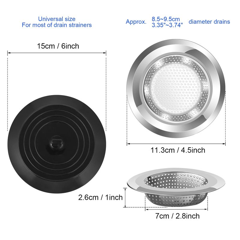 - 【Widely used】Our sink strainer stoppers kit are not only a kitchen drain strainer and sink hole cover, you may also use it in bathtubs and other drains, not only does it store water, but it also stops the odor from moving upwards. Please kindly note, drain strainer is suitable for approx 8.5-9.5cm diameter drains, drain stopper is only suitable for flat smooth surfaces.