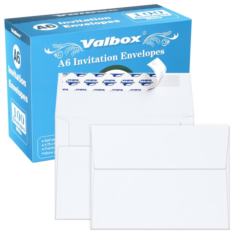 - 【Premium 100 Pack White A6 Invitation Envelopes 4.75 x 6.5 Inches】A6 wedding envelopes with self seal dimensions are 4.75 x 6.5 inches. Perfect for A6/4x6 photos, greeting cards, Christmas cards, announcements, thank you notes, RSVP, save the dates, invitations. Event: wedding, birthdays, baby showers, graduations, holiday, party and more. Valbox kraft envelopes come in a nice storage box.