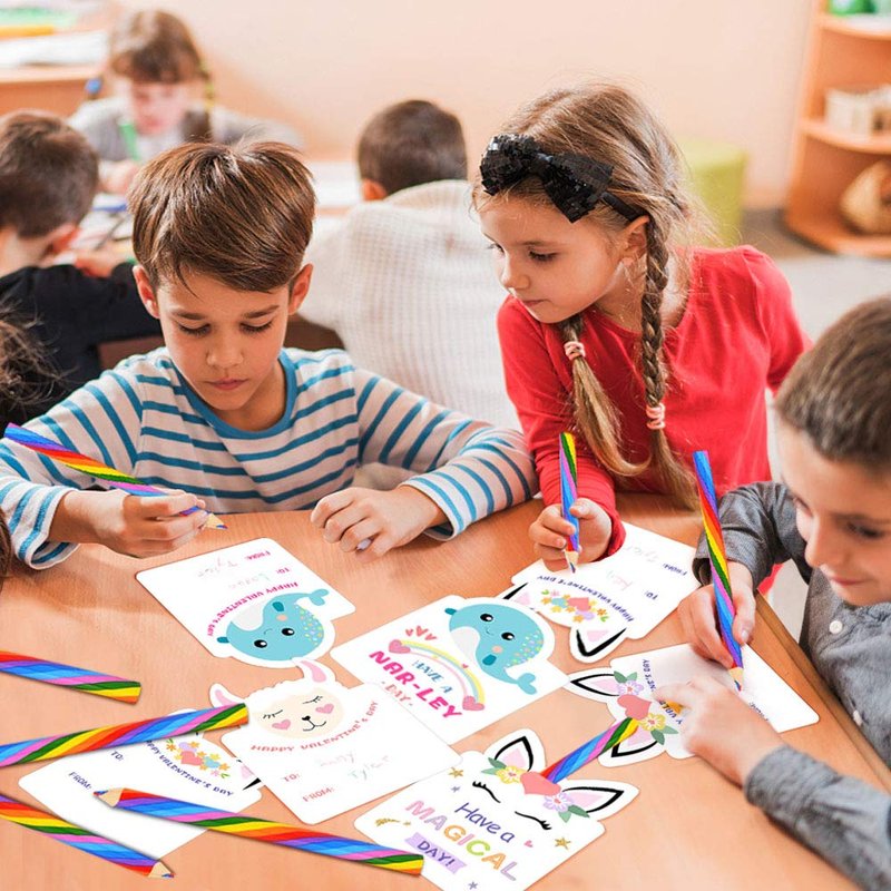 Valentines Day Cards for Kids - Set of 24 Rainbow Pencils Unicorn Valentines - Class Party Favors Valentine day cards Exchange Bulk for Girls Boys School Classroom Supplies
