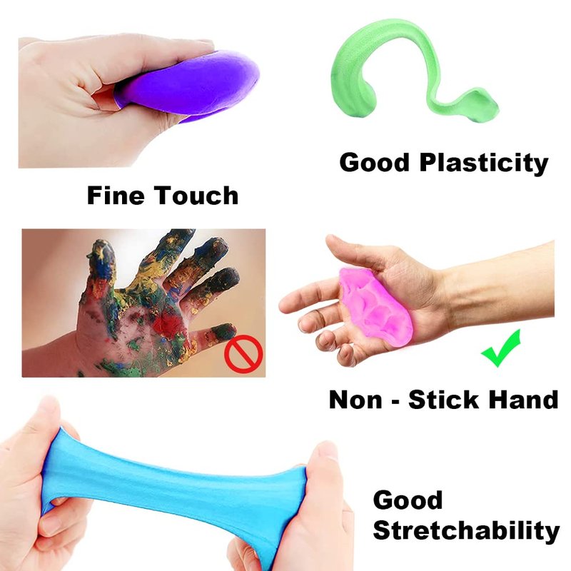 - PREMIUM QUALITY & SAFETY: Our playing dough slime for kids is made of high quality materials. They are non-toxic, environmentally friendly, non-staining and non-sticky. So it can be safely used, but it's important to note that children under 3 years old should be used under the attention of adults, to avoid accidental ingestion.