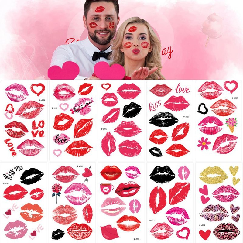- SEXY LIP TATTOOS: You will receive 10 sheets Valentine's Day temporary tattoo stickers with 84 patterns with designs of lips, hearts, “love”, “kiss” and flowers. Full of cute and sweet elements, making you bubbling with happiness all the time. Beautiful fake tattoos, just stick them on to show your love.