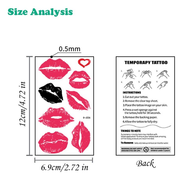 Quantity: 10 sheetsMaterial: Safe and environmentally friendlyEach size: 4.72*2.72 inches (12cm*6.9cm)Features1. Long lasting, generally maintained for 3-5 days.2. Rich patterns, full of sex and love.3. Waterproof and sweat-proofHow to use?1. Choose the tattoo you like and remove the transparent film.2. Put the tattoo face down on the skin.3. Use a sponge or towel to thoroughly wet the tattoo.4. After 20-30 seconds, gently remove the backing paper. Pay attention to observe whether the ink is completely transferred, if not, you can re-wet it.5. Let the tattoo dry.How to remove?1 Wipe the temporary tattoo with alcohol or makeup remover or cold cream or baby oil, and then wait 10 seconds.2. Rub again gently and repeatedly until the tattoo disappears or scrub with soap and water.