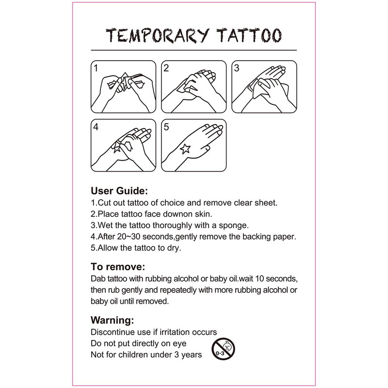 - 💋Instructions: Put the tattoos and wet it, in less than 30 seconds with long lasting tattoos, which also can be easily removed by wiping with soap or baby oil.