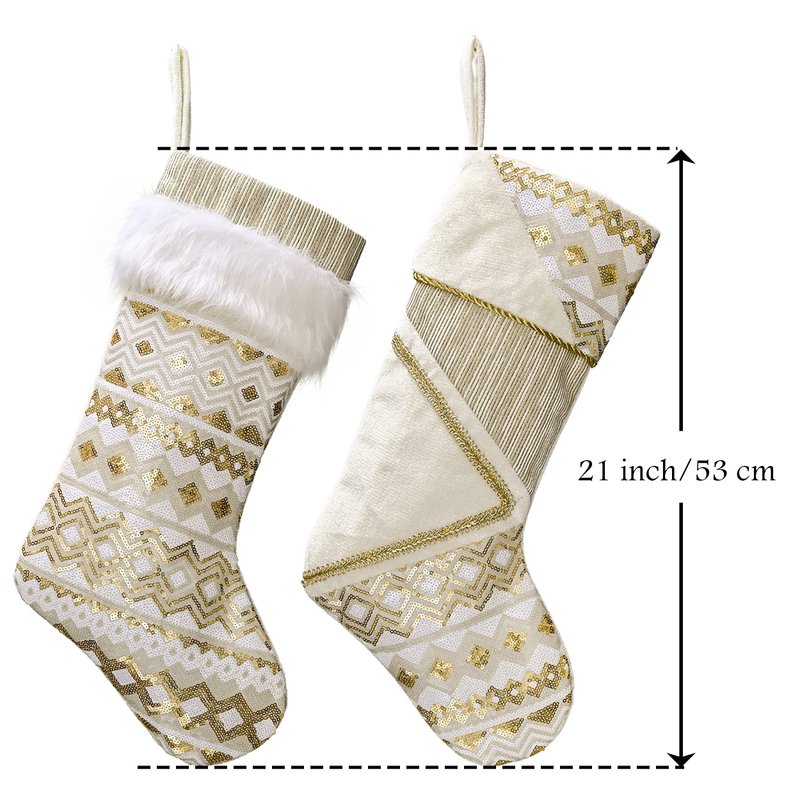 - 【Premium Quality】This white gold stocking is made of high-quality fabric and brings good air permeability, durability, and a comfortable touch. The socking has no patterns on the back, making it easier to hang. It's perfect for families with children or pets. Please note that machine washing is not recommended for optimal care.