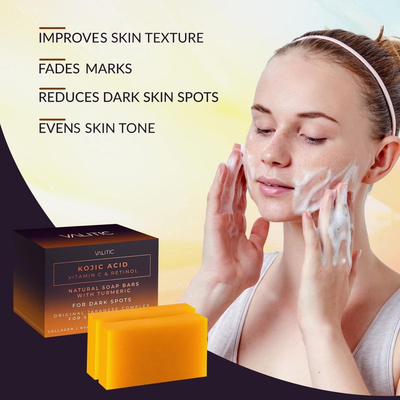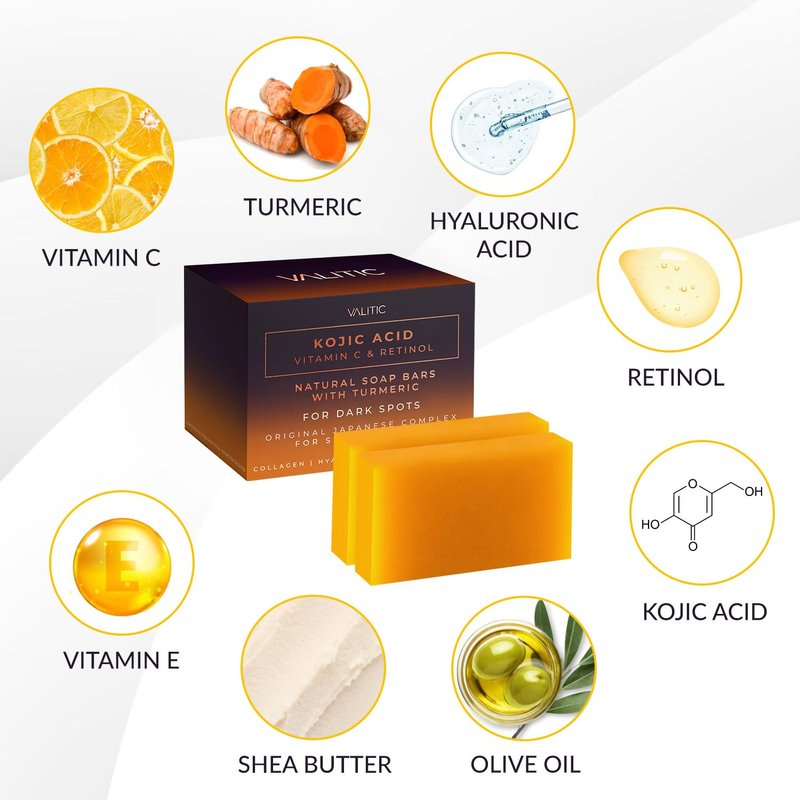 - Kojic Acid, Vitamin C and Retinol: Our soap's main ingredient has a nourishing formula for dark spot correction and is infused with Vitamin C and Retinol that helps restore radiance to aging skin