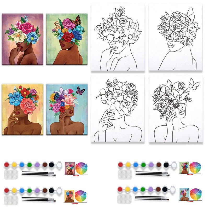 VALLSIP 4 Pack Pre Drawn Canvas for Painting for Adults Paint and Sip Party Supplies Canvas Painting Kits Stretched Canvas to Paint Games Anniversary Gifts Ladies Night Flowers Girl Art Set(8x10)