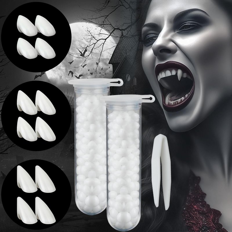 - PACKAGE INCLUDES: 3 different sizes of vampire teeth - 13mm, 15mm, and 17mm, along with a tube of 2 teeth pellet adhesive, 1 small plastic tweezer. (No need to purchase adhesive separately)