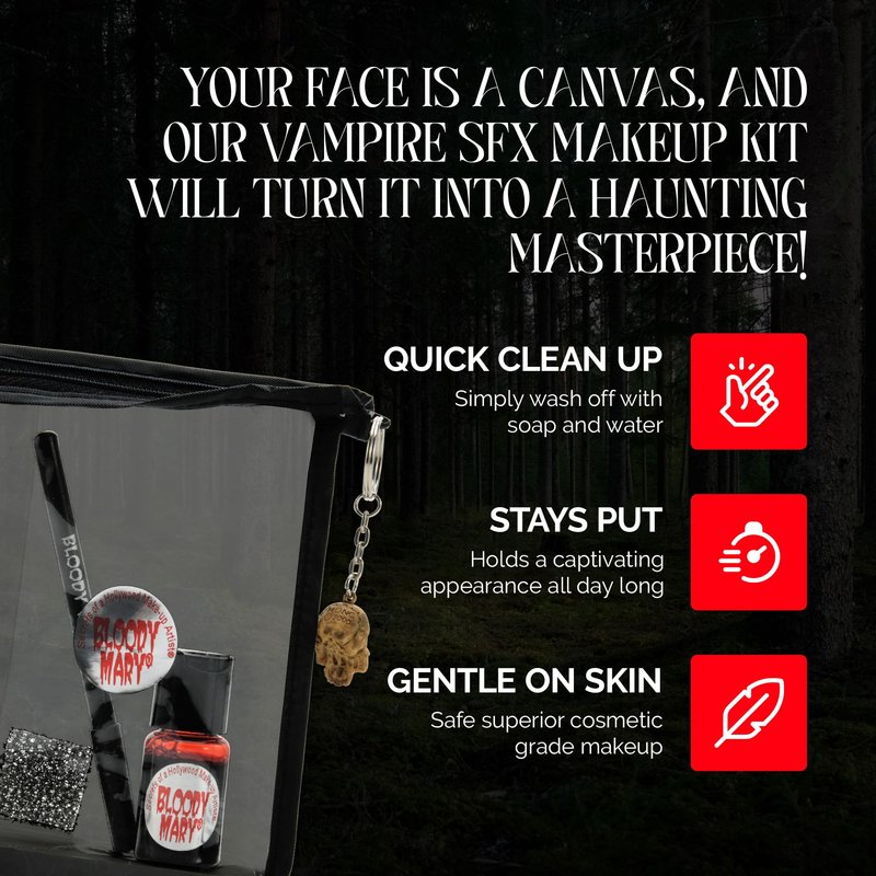 Achieve a professional appearance with the easy step-by-step instructions and transform yourself into a ghastly vampire with this kit. Perfect for creating creepy looks that are so realistic it's scary, our makeup kit allows you to indulge in the fantasy world of vampires for a Halloween party, or bring a Hollywood-worthy look to life for stage performers in a quick and convenient way.