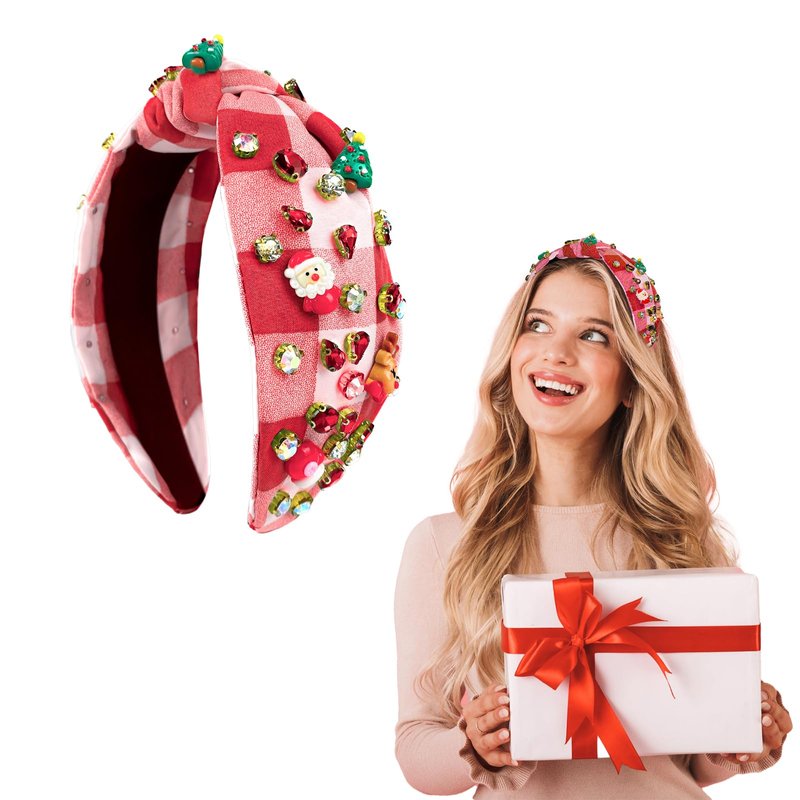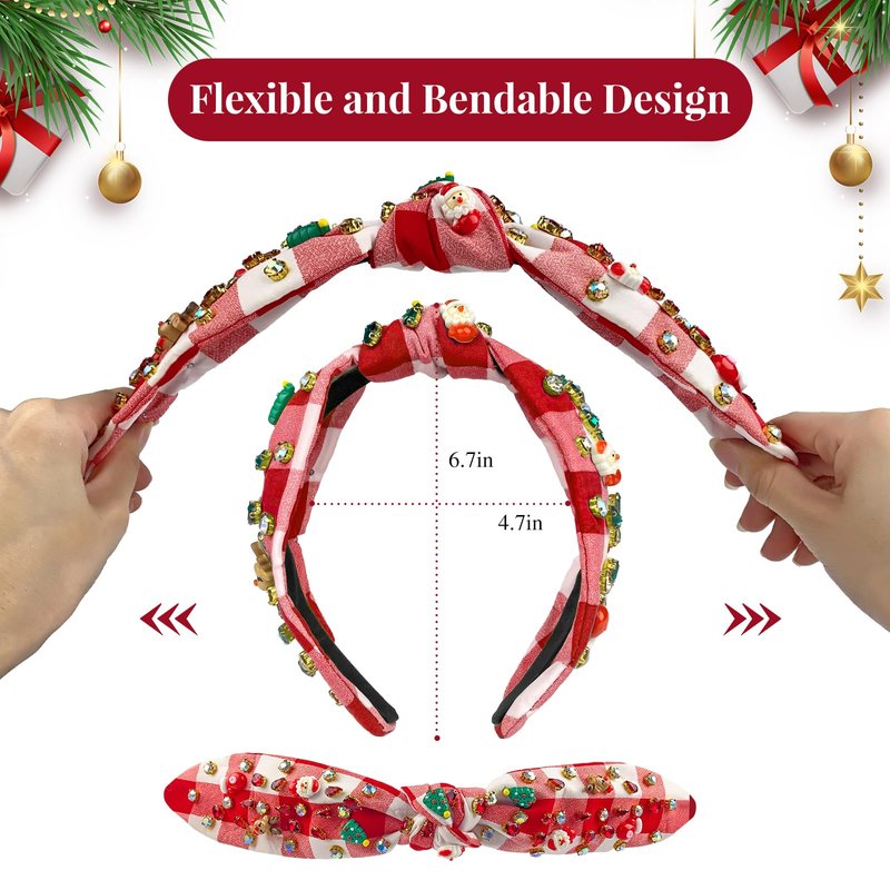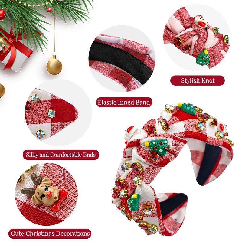 - Stunning Christmas Design: Our knotted headband for women is made with exquisite red and white plaid cloth, adorned with sparkling red and white rhinestones featuring Christmas tree, Santa Claus, reindeer, and Christmas glove motifs. This jeweled headband for women is a fashionable statement to welcome the holiday season.