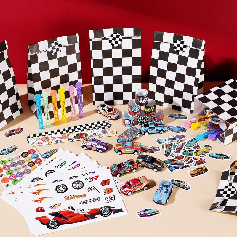 - PERFECT RACE CAR PARTY FAVORS - Our Set includes 50PCS Stickers, 12PCS DIY race car stickers,12PCS Treat candy bags, 12PCS Slap bracelets in 12 styles,12PCS MINI race car toys,12PCS Bubble wands(with bubble wand mini stickers,you can match your own bubble wand).