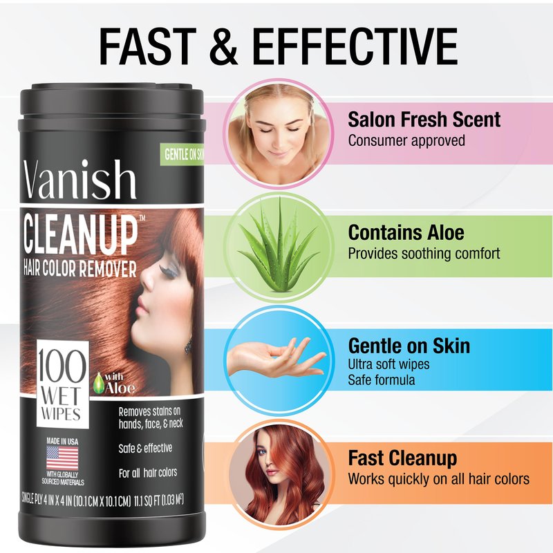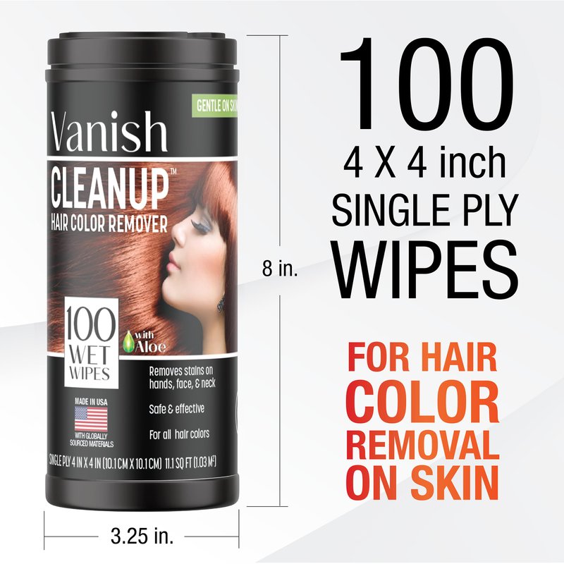 Vanish Cleanup Hair Color Remover 100 Count safely removes color stains from skin. Before using wipes, test on a small part of your inner arm to determine sensitivity. If skin becomes irritated discontinue use. Recommended for use on stains before color dries. After washing hair, if there are remaining stains, wipe gently. Rinse with water.